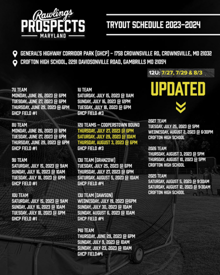 **Tryouts will be held at General's Highway Corridor Park, Field #4, 1758 Crownsville Rd, Crownsville, MD 21032***